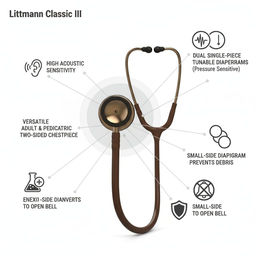 The Littmann Classics set the standard for clinical use and the Classic III features many beneficial upgrades that enhance acoustic sensitivity.